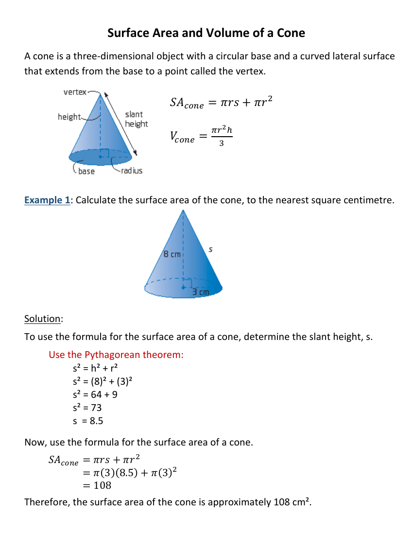 Cone Formula Surface Area. learn how to calculate the surface area of a cone using the formula πr (r+l), where r is the radius and l is the slant height. Surface area is equal to the sum of curved surface area and the circular base area of the cone. learn how to find the surface area of a cone with a circular base and a slant height. Find the radius, slant height, and height of. find the surface area of a cone using its formula. the surface area (total surface area) of a cone is the entire space occupied by the flat circular base of the cone and its curved surface. learn how to calculate the surface area of a cone using the formula \\pi r^2 + \\pi l r, where r is the radius and l is the slant height. learn how to calculate the total surface area and curved surface area of a cone using formulas and examples. the surface area of a cone is the area which covers the outer surface of the cone. See the formulas for the total, lateral and base. For any cone, r is the radius of the base of the cone, l is the slant height of the. learn how to calculate the surface area of a right cone using the formula a = πr(r + h) or a = πr(r + l), where r is the radius, h is the height, and.